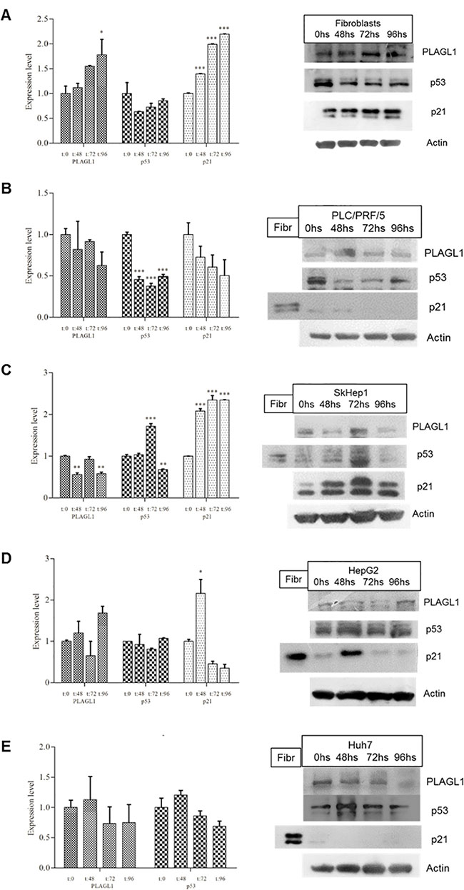Figure 7: Expressiont level of PLAGL1, p53 and p21 of each cell line during proliferation. The Western blot data corresponding to each time point was compared with that of T = 0 h. (A) Fibroblasts. (B) PLC/PRF/5. (C) SkHep1. (D) HepG2. (E) Huh7. A protein extract from fibroblasts (Fibr) was used as a signal control for the antibody p21. Representative blots are shown at the side of each graph. Actin was used as loading control. Bars represent mean ± SD. Asterisks indicate statistically significant differences; *p < 0.05, **p < 0.001, ***p < 0.0001.