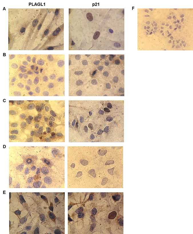Figure 8: Immunocytochemistry for PLAGL1 and p21 proteins in tumor and normal cells. Microscopic exam of the preparations revealed that PLAGL1 protein localized only in the cytoplasm of tumor cells, while p21 exhibited both nuclear and cytoplasmatic localization. Similar to Western blot analysis, this protein was not detected in Huh7 cells. (A) Fibroblasts; (B) PLC/PRF/5; (C) HepG2; (D) Huh7; (E) SkHep1; (F) Negative control. Magnification 1000× (A–E) and 400× (F).