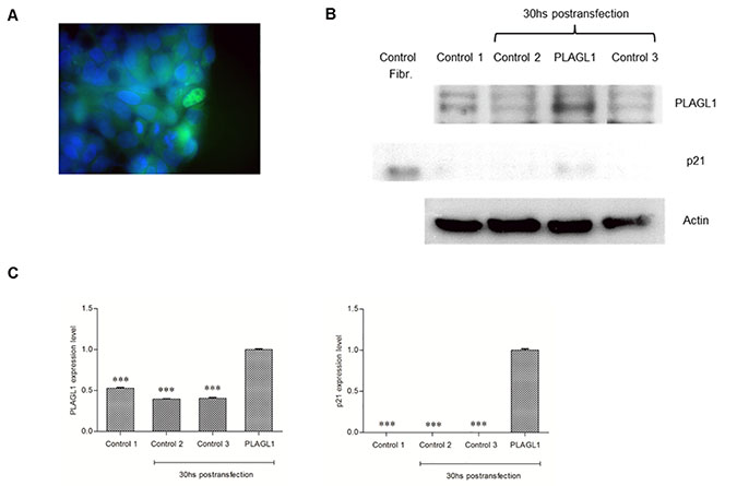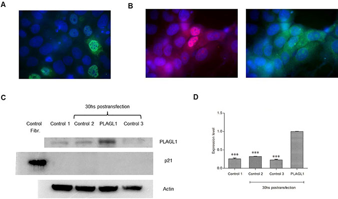 Figure 10: Overexpression of PLAGL1 protein in PLC/PRF/5 cells. (A) Immunofluorescence of transfected cells with an antibody anti-PLAGL1(Green). (B) Immunofluorescence of transfected cells with antibodies against PLAGL1 (Red) and p21 (Green). (C) Representative blots of PLAGL1 and p21 proteins. A protein extract from fibroblasts (Fibr.) was used as a signal control for the antibody against p21. Actin was used as loading control. (D) PLAGL1 relative expression: Control 1 = T: 0 hs; Control 2 = No plasmid; Control 3 = Empty plasmid; PLAGL1 = PLC/PRF/5 cells transfected with the plasmid prk7-PLAGL1. Bars represent mean ± SD. Asterisks indicate statistically significant differences (***p < 0.0001).