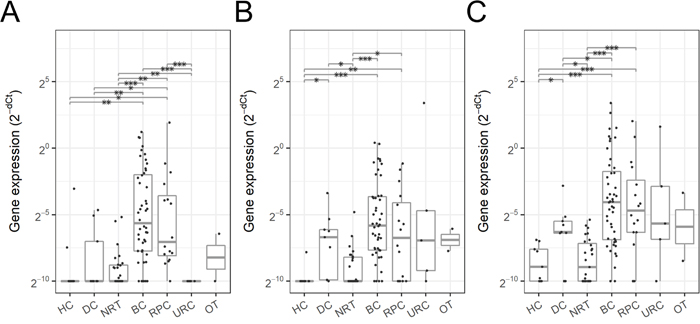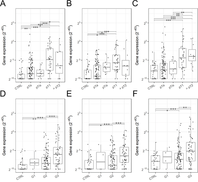Bladder cancer marker candidates as well as reference genes (ACTB, GAPDH, ALDOB) were assayed by RT-qPCR in 254 urine samples including 173 bladder cancer patient urine samples (Table 2). To select a reference gene, raw gene expression level or real-time PCR threshold cycle (Ct) value of reference gene candidates was analyzed by analysis of variance (ANOVA) (Supplementary Table 3). ANOVA indicated that ACTB and GAPDH were differentially expressed among the diagnostic groups such as bladder cancer stage and grade. On the other hand, ALDOB was highly expressed in urinary EV (mean Ct = 24.1 and median Ct = 23.9) and not differentially expressed among any diagnostic groups such as cancer type, bladder cancer stage and grade, therefore ALDOB was selected as a reference gene.