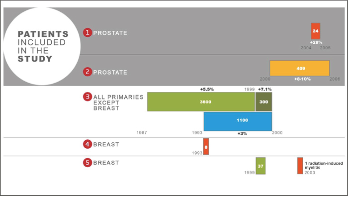 Between 1987 and 2007, the Epinal adverse event involved the radiation overdosage of approximately 5,500 patients, the majority of whom suffered from late radiation-induced toxicity after treatment for prostate cancer [11]. This adverse event, which rated 6/7 on the French Society for Radiation Oncology (ASN/SFRO) scale, consisted of five episodes over the entire duration [12] (Figure 1)