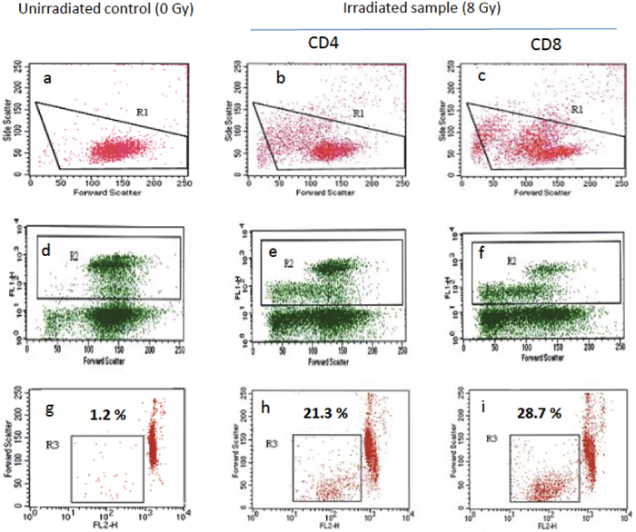 Figure 2: Radiation-induced lymphocyte apoptosis (RILA) flow cytometry profile. Lymphocytes were selected (R1) from double-scatter dot plots (a-c) i.e. cell granularity (side scatter) and cell size (forward scatter). CD8 T-lymphocytes (R2) were then selected from R1 gated area as anti-CD4 or anti-CD8 FITC-conjugated antibody fixing cells (FL1H) (d-f). CD4 (h) or CD8 (i) T-lymphocyte apoptosis rate (R3) was then calculated from the fraction of cells from R2 gated area with reduced size (forward scatter) and reduced DNA content i.e low propidium iodide labeling (FL2H). RILA was calculated after deduction of apoptosis rate of unirradiated controls (g) from irradiated samples (h, i): respectively 20.1 and 27.5 % for CD4 and CD8 RILA in the present illustrative example.