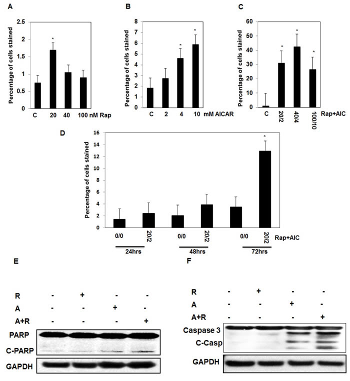Figure 1: Significant increase in number apoptotic cells is dependent on drug concentration and duration of exposure in AML cells. Serial concentrations of A., rapamycin (0-100nM), B. AICAR (0-10mM) C., drug combinations (0/0-2/20,4/40 and 10/100 mM/nM) in cells treated for 72hrs show that increase in number of apoptotic cells is dose-dependent using annexin V-FITC conjugated to PI by flow cytometry. In addition, treatment of the cells with drug combinations for 24, 48, and 72hrs D., show that increase in number of apoptotic cells is time dependent. Apoptotic data was confirmed in cells by measuring apoptotic protein expression. Lysates from cells treated with rapmycin (20 nM), AICAR (2 mM), rapamycin+AICAR (20 nM/2 mM) for 72hrs were subjected to Western blot analysis to measure PARP and caspase 3 cleavages. E. & F. Significant increase was detected in cleavage of PARP at 85 KDa and caspase 3 at 22, 17 and 11KDa in AML cells treated with drug combinations compared to cells treated with each drug alone for 72hrs. GAPDH was used as a loading control. Data represent means±SE (n = 4). Significant difference from control tissues is indicated by * P < 0.01.