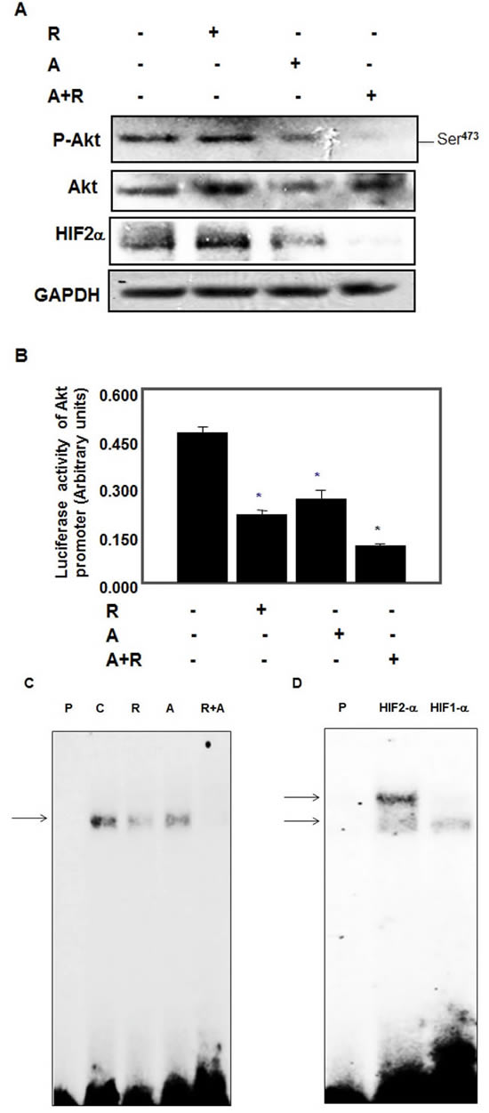 Figure 3: Drug combinations abolished Akt survival kinase and blocked binding of HIF-2α to Akt promoter in AML cells. Cells were treated with rapamycin (20 nM) or AICAR (2 mM) or drug combinations (20 nM rap/2 mM AICAR) for 72 hrs. Cell lysates were subjected to Western blot analysis to measure p-Akt, HIF-2α expression. A. Significant decrease in p-Akt, HIF-2α expression in cells treated with single drug while synergistic effect of drug combinations showed complete abolishment in HIF-2α as well as in phosphorylation of Akt at Ser473 expression compared to cells treated with single drug and control cells. GADPH was used as a loading control. Further evidence of the effect of drug combinations on HIF-2α function was measured by luciferase assay. B. The synergistic effect of drug combinations showed more than 70% decrease in the promoter activity of HIF-2α compared to control cells using the Luciferase Reporter Assay System normalized by Renilla activity and measured by a luminometer. Data represent means±SE (n = 4). Significant difference from control cells is indicated by * P < 0.01. A combination of drugs blocks binding of HIF2α to the Akt promoter element. C. EMSA analysis of DNA probe corresponding to the putative HIF-2α binding site in the Akt promoter was performed. Labeled probes were incubated with nuclear extracts isolated from AML cells treated with rapamycin, AICAR or rapamycin+AICAR showed significant decrease in binding of HIF-2α into the Akt promoter. D. Specificity of binding of HIF-α to Akt promoter was confirmed by adding HIF1α or HIF-2α antibody to the reaction mixture. Data confirmed that HIF-2α not HIF-1α as a part of DNA-protein complex. These data provide new evidence that HIF2α is a major transcription factor that regulates cell survival kinase Akt.