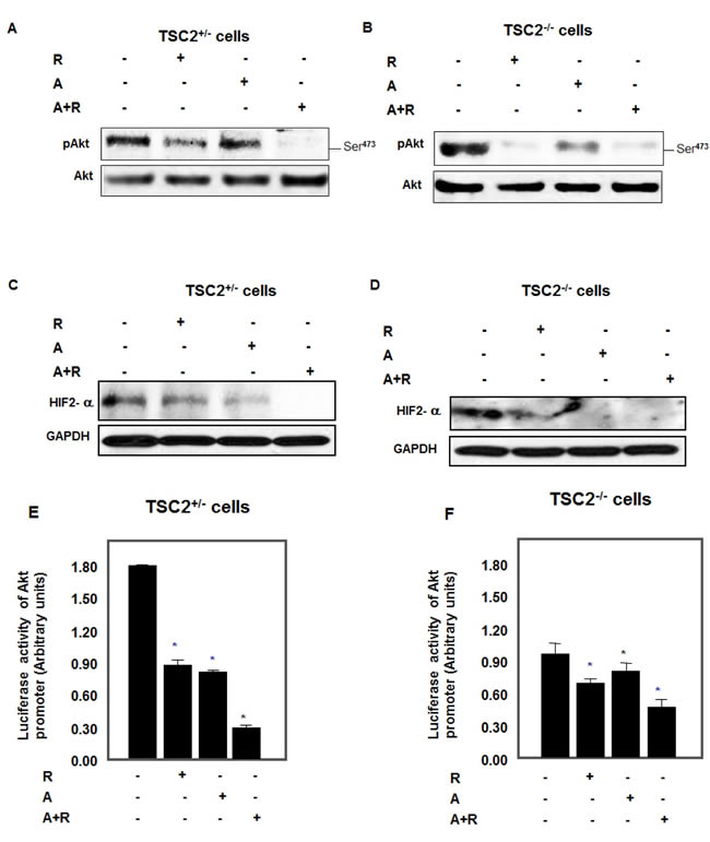 Abolishment of Akt phosphorylation at Ser473 expression was detected in TSC2+/- and TSC-/- cells treated with drug combinations compared to cells treated with single drug and control cells (Figure 7A-7D). In addition, rapamycin and AICAR significantly decreased phosphorylation of Akt and HIF2α expression compared to non-treated TSC2+/- and TSC-/- cells (Figure 7A-7D). Moreover, the effect of each drug or drug combinations on Akt promoter activity was tested in TSC2+/- and TSC-/- primary cells. Data in Figure 7E & 7F show significant decrease in Akt promoter activity measured by luciferase compared to non-treated cells, while sharp decrease in Akt promoter activity was observed in cells treated with drug combinations in TSC2+/- and TSC-/- cells (Figure 7E & 7F). These data provide a new evidence of synergistic effect of drug combinations on blocking AKT/HIF-2 pathway to decrease tumor progression. These data also provide strong evidence that drug combinations will be more effective than each drug alone to treat TSC2+/- mice.