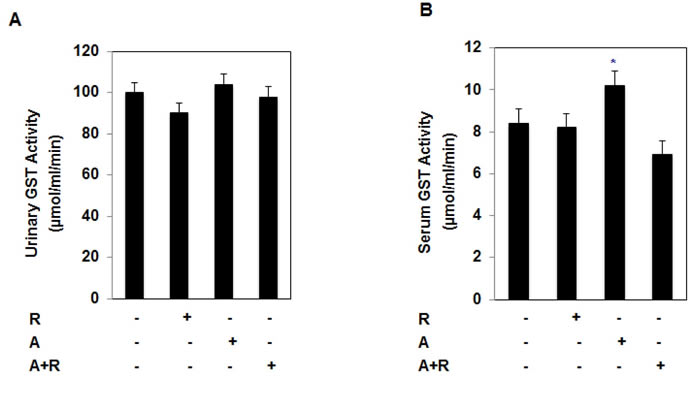 Urinary excretion of glutathione-S-transferase (GST) an indicator of the loss of cell membrane integrity was used as a marker of kidney toxicity. GST was measured in urine from all mice groups. In addition, GST was also measured in serum from each mouse. GST was measured using dinitrochlorobenzene and glutathione (GSH) as substrate and co-substrate respectively [26]. Final data represents as one unit of GST activity is the formation of 1 μmol of dinitrochlorobenzene GSH conjugate/ml/min at pH 6.5 and 25°C.
