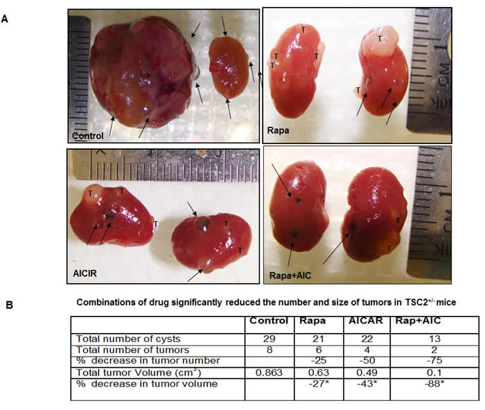Figure 9: Synergistic effect of drug combinations resulted in significant decrease in kidney tumor size and number in TSC2+/- mice. A. Macroscopic view of all mice kidneys was examined for cysts, number and size of tumors. Tumor size was measured in three axes as cm3 (length, width, and height). B. Treatment with rapamycin resulted in significant decrease in cysts number, 25% decrease in tumor number and 27% decrease in tumor volume compared to control mice. AICAR treatment showed 50% decrease in tumor number and 43% in tumor volume compared to non-treated group. Major decrease in tumor size and number was noticed in mice treated with drug combinations and resulted in 75% decrease in tumor number and 88% decrease in tumor volume compared to non-treated mice. Cysts marked with arrow and tumor marked with T. Significant difference from control mice is indicated by * P < 0.01.