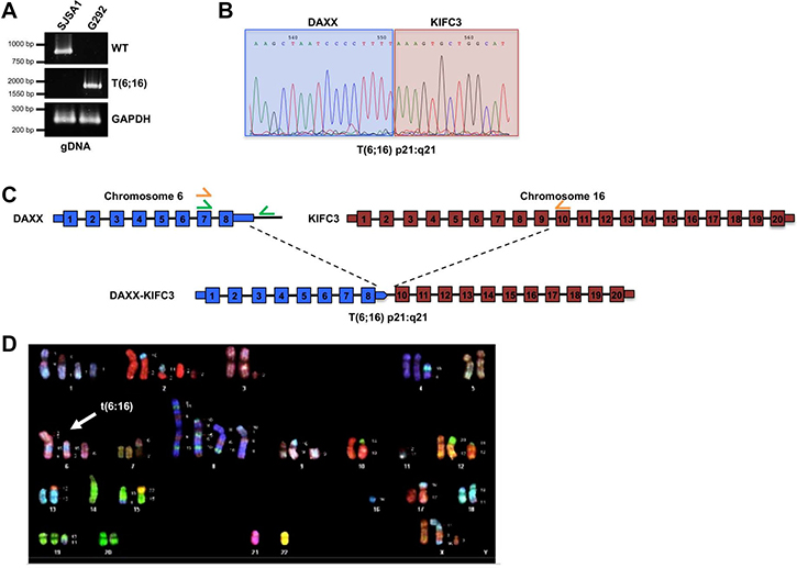 Figure 2: Structural characterization of the DAXX gene locus. (A) PCR amplification of the wild type DAXX gene locus or the DAXX-KIFC3 fusion using genomic DNA isolated from SJSA1 or G292 cells. GAPDH was amplified as a control. (B) Representative chromatogram from Sanger sequencing of the DAXX-KIFC3 gene fusion PCR product amplified from G292 cells. Sequence shown highlights the region where the fusion event occurs at the genomic DNA level now defined as t(6:16). (C) Schematic of the t(6;16) fusion in genomic DNA in G292. The 3’UTR of DAXX is fused to intron 9 of KIFC3. Wild type DAXX primers are shown in green, t(6;16) primers are shown in orange. (D) Representative metaphase from spectral karyotyping (SKY) analysis of G292 cells.