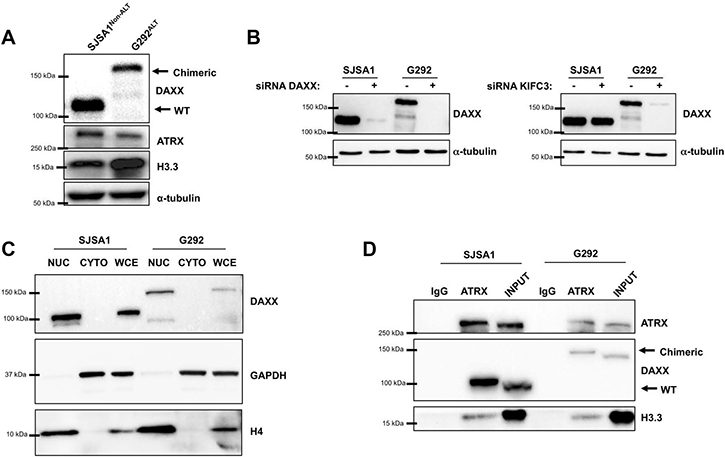 Figure 3: The DAXX-KIFC3 fusion leads to expression of a chimeric protein. (A) Western blot of SJSA1 and G292 cells for DAXX, ATRX, H3.3 or α-tubulin. Chimeric DAXX-KIFC3 protein runs at a higher molecular weight in G292 cells compared to wild type DAXX in SJSA1 cells. (B) Western blot for DAXX in SJSA1 and G292 cells following 48 hour reverse transfection with 100 nM siRNA targeting either DAXX (left panel) or KIFC3 (right panel). α-tubulin was used as a loading control. (C) Western blot for DAXX, GAPDH and Histone H4 following cellular fractionation. Nuclear fractions (NUC), cytoplasmic fractions (CYTO) or whole cell extracts (WCE) of SJSA1 and G292. GAPDH and Histone H4 were used to demonstrate successful separation of cytoplasmic and nuclear fractions. (D) Immunoprecipitation of ATRX followed by ATRX, DAXX, and H3.3 detection by Western blot in SJSA1 and G292.
