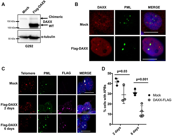 Figure 4: Expression of WT DAXX represses APB formation. (A) Western blot of G292 cells either mock transfected or transfected with wild-type Flag-DAXX detecting DAXX or α-tubulin. Both chimeric DAXX and Flag-DAXX are detected in the transfected cells, with chimeric DAXX running at a higher molecular weight than wild-type Flag-DAXX. (B) Representative images from immunofluorescence analysis of G292 cells mock transfected or G292 cells transfected with Flag-DAXX for 2 days. Cells were stained for DAXX, PML and DAPI. Scale bar is 10 μm. (C) Representative images of combined immunofluorescence-FISH analysis of APBs in mock transfected G292 cells or G292 cells transfected with Flag-DAXX for 2 or 6 days. Cells were stained by immunofluorescence for PML and FLAG, and by FISH for telomeres. Arrow indicates APB in a positive cell. Scale bar is 10 μm. (D) Quantification of APB data shown in (C), counting a cell positive for APB if it has ≥ 1 large or 3 small telomeres colocalization events and counting a cell positive for Flag-DAXX transfection if it has ≥ 3 Flag foci. P-values denoted comparing mock and Flag-DAXX transfected cells at each time point using two-way ANOVA followed by Bonferroni test for multiple comparisons. n ≥ 3 independent experiments with ≥ 150 Flag-DAXX positive cells counted total.