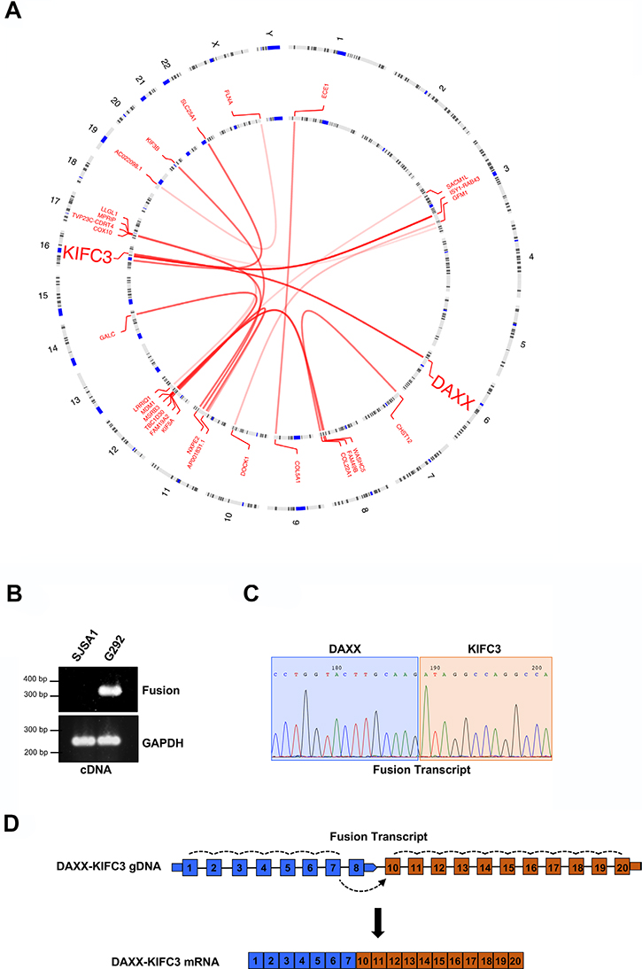 Figure 1: Identification of a DAXX-KIFC3 fusion transcript in an ALT positive osteosarcoma. (A) Circos plot generated using the OmicCircos package following RNA sequencing of the G292 cell line. Lines represent the predicted interchromosomal fusion transcripts. (B) RT-PCR amplification products from SJSA1 and G292 RNA using primers that either flank the predicted transcriptional fusion site or amplify GAPDH as a control. (C) Representative chromatogram of the Sanger sequencing results from the RT-PCR product generated from G292 RNA. Sequence shown highlights the region where the fusion event between DAXX and KIFC3 occurs. (D) Schematic of the fusion transcript that contains exons 1–7 of DAXX and exons 10–20 of KIFC3. Dotted lines indicate splicing events.