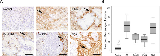 Pancreatic ductal adenocarcinoma (PDA) is the most frequent type of pancreatic cancer and presents the worst prognosis of all tumors. It is currently the fourth leading cause of cancer-related deaths in Western countries and is predicted to rise to the second by 2030 [1]. The most accepted model for PDA progression is that tumors arise through the progressive accumulation of genetic alterations in normal cells, starting with non-invasive precursor lesions called pancreatic intraepithelial neoplasia (PanINs) and ending with infiltrating ductal adenocarcinoma [2]. K-Ras activation and telomere shortening are early molecular events in this pathway, while inactivation of INK4A/p16 and inactivating mutations of TP53 and SMAD4 occurs in intermediate (PanIN-2) or late stages of progression (PanIN-3), respectively [2]. Although PanINs are the most widely studied and common PDA precursors, extensive data indicate that intraductal papillary mucinous neoplasms (IPMNs) and mucinous cystic neoplasms (MCNs) are also important pancreatic preneoplastic lesions [3]. Risk factors associated with PDA etiology include smoking, obesity and chronic pancreatitis (CP) [4, 5]. CP is a severe disorder with an annual incidence ranging from 5–12/100,000 persons, and it leads to a significant reduction of quality of life [6]. Pancreatic inflammation accelerates PDA initiation and progression in mouse models of this disease [7]. As both PDA and CP initially display similar vague symptoms, such as abdominal pain, digestive symptoms, weight loss and inflammation, differential diagnosis between both diseases is very difficult at early stages—yet early diagnosis is crucial for treatment of PDA.
