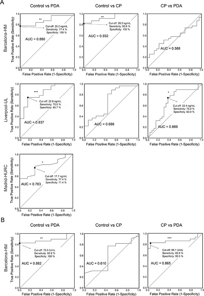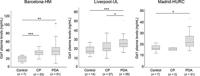 Figure 2: Plasma levels of Gal-1 from healthy controls, CP and PDA samples from the three different cohorts. Box-and-whisker plot representation of Gal-1 levels in Barcelona-HM (left), Liverpool-UL (center) and Madrid-HURC (right) cohorts. *p < 0.05; **p < 0.01; ***p < 0.001 (Mann–Whitney test).