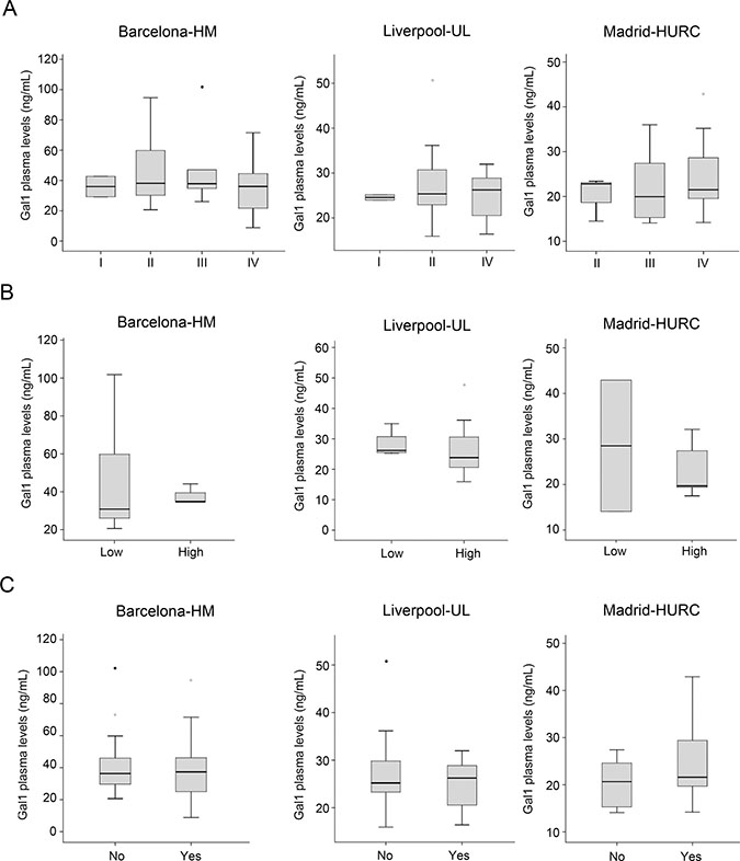 As Gal-1 can be secreted [29], we next analyzed circulating Gal-1 in healthy individuals and patients with CP or PDA. Three independent cohorts of patients were used: Barcelona-HM (n = 61 individuals), Liverpool-UL (n = 69 individuals) and Madrid-HURC (n = 40 individuals) (see Materials and Methods for breakdown of each cohort, and Supplementary Table 2 for clinicopathological data of patients). To avoid deviations due to sample handling and processing, each cohort was analyzed separately.