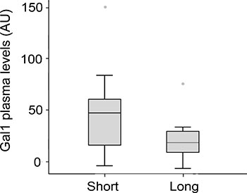 Figure 5: Gal-1 plasma levels in PDA patients displaying short-(<6 months) or long-term survival (≥6 months).