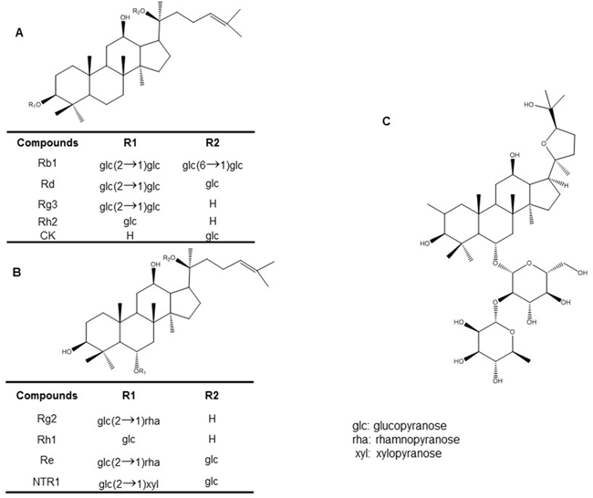 Figure 1: Chemical structures of various active ginseng components: (A) protopanaxadiol type ginsenosides (B) protopanaxatriol-type ginsenosides (C) pseudoginsenoside-F11.