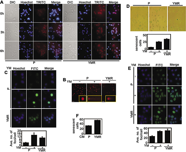 Figure 3: YMR cells undergo persistent DNA damage associated with chronic YM155 treatment. (A) Measurement of ROS levels following 40 nM YM155 treatment in P versus YMR cells for 3 h and 6 h. Hoechst is nucleus and TRITC is ROS. (B) Comet assay demonstrating extent of DNA damage in 40 nM YM155 treated (12 h) P and YMR cells. (C) Comparison of γH2AX (FITC) foci formation (top panel: images, bottom panel: quantitation) between P and YMR cells treated with 40 nM YM155 for 72 h. YMR versus P comparison is statistically significant at p < 0.05 (0.0007). (D and E) Assessment of TIS induction as determined by (D) SA-βgal immunohistochemistry and (E) SAHF (FITC) formation in P and YMR cells exposed to 40 nM YM155 for 72 h. In both (D and E), bottom panels represent quantitation of the figure from the top panels. YMR versus P comparison is statistically significant at p < 0.05 (7.40396E-11: D; 0.0181: E). (F) SA-βgal assay comparing senescence induction in MCF-7 cells exposed to CM collected from P and YMR cells for 72 h.