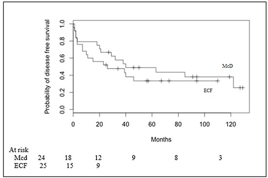 Figure 2: Disease free survival in Macdonald (Mcd) patients and ECF patients.