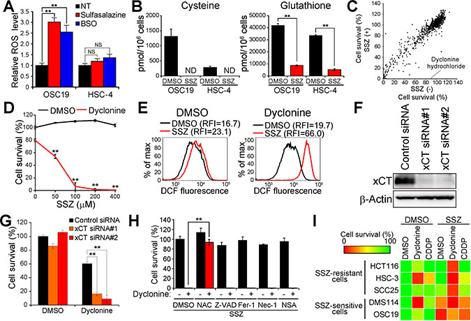 Figure 1: Screening for drugs that sensitize cancer cells to sulfasalazine. (A) Intracellular ROS level in OSC19 and HSC-4 cells incubated with 350 μM sulfasalazine or 100 μM BSO for 24 h. Data are expressed relative to the corresponding value for nontreated (NT) cells and are means ± SD from three independent experiments. **P < 0.01; NS, not significant (Student’s t test). (B) Intracellular content of cysteine or GSH in OSC19 and HSC-4 cells cultured in the presence of sulfasalazine (SSZ, 400 μM) or dimethyl sulfoxide (DMSO) vehicle for 24 h. Data are means ± SD from three independent experiments. **P < 0.01 (Student’s t test). ND, not detected. (C) Screening of a drug library for sulfasalazine-sensitizing agents (30 μM) in HSC-4 cells. Horizontal and vertical axes indicate survival of HSC-4 cells cultured for 48 h in the absence or presence of sulfasalazine (300 μM), respectively. The red dot in the scatter plot represents the results for dyclonine. (D) HSC-4 cells cultured for 48 h with the indicated concentrations of sulfasalazine and in the presence of either dyclonine (50 μM) or DMSO vehicle were assayed for cell viability. Data are means ± SD from three independent experiments. **P < 0.01 versus the corresponding value for cells not exposed to sulfasalazine (Student’s t test). (E) HSC-4 cells cultured with sulfasalazine (400 μM) or DMSO and in the absence or presence of dyclonine (50 μM) or DMSO for 6 h were assayed for ROS by flow cytometric analysis of dichlorofluorescein (DCF) fluorescence. RFI, relative fluorescence intensity; max, maximum. (F) Immunoblot analysis of xCT and β-actin (loading control) in HSC-4 cells transfected with control or xCT (#1 or #2) siRNAs. (G) HSC-4 cells transfected with control or xCT siRNAs were cultured in the presence of dyclonine (50 μM) or DMSO for 48 h and then assayed for viability. Data are means ± SD from three independent experiments. **P < 0.01 (Student’s t test). (H) HSC-4 cells were cultured for 48 h in the presence of sulfasalazine (400 μM), with or without dyclonine (50 μM), and in the presence of DMSO, N-acetylcysteine (NAC, 3 mM), Z-VAD(OMe)-FMK (Z-VAD, 30 μM), ferrostatin-1 (Fer-1, 2 μM), necrostatin-1 (Nec-1, 30 μM), or necrosulfonamide (NSA, 3 μM). They were then assayed for cell viability. Data are means ± SD from three independent experiments. **P < 0.01 (Student’s t test). (I) The indicated cancer cell lines were cultured for 48 h with DMSO, sulfasalazine (400 μM), dyclonine (50 μM), or cisplatin (CDDP, 5 μM), as indicated, and were then assayed for viability. Data are means from three independent experiments and are presented as a heat map.