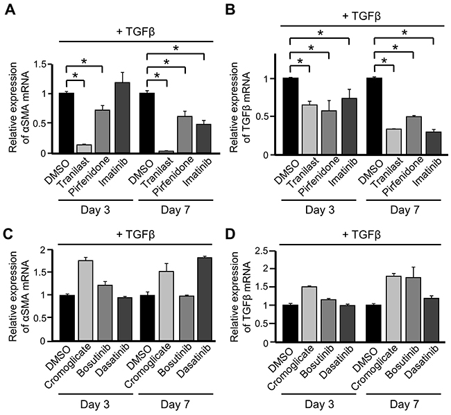 Figure 2: PDGFRs may be involved in the suppressive effects of various drugs on differentiation into cancer-associated fibroblasts (CAFs). (A, B) ST2 cells were pre-treated with tranilast (100 μM), pirfenidone (0.2 mg/mL), or imatinib (10 μM) for 1 h and then stimulated with TGFβ (10 ng/mL) for 3 and 7 days. Quantitative RT-PCR analysis was performed to measure mRNA expression of αSMA (A) and TGFβ (B). Each bar represents the mean ± SD (N=3), *P < 0.05. (C, D) ST2 cells were pre-treated with cromoglicate (100 μM), bosutinib (100 nM), or dasatinib (10 nM) for 1 h and then stimulated with TGFβ for 3 and 7 days. Quantitative RT-PCR analysis was performed to measure mRNA expression of αSMA (C) and TGFβ (D). Each bar represents the mean ± SD (N=3).