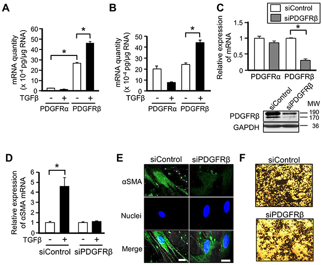 Figure 3: PDGFRβ is involved in the differentiation of mesenchymal stem cells (MSCs) into cancer-associated fibroblasts. (A, B) Absolute quantitative RT-PCR analyses were performed to measure mRNA expression of PDGFRα and PDGFRβ in ST2 cells (A) and human MSCs (B) stimulated with or without TGFβ (10 ng/mL) for 48 h. The absolute quantity of mRNA was converted to picograms. Each bar represents the mean ± SD (N=3), *P < 0.05. (C) ST2 cells were transfected with PDGFRβ-targeting or negative control siRNA for 48 h, and then mRNA expression of PDGFRα and PDGFRβ was measured by quantitative RT-PCR analysis. Each bar represents the mean ± SD (N=3), *P < 0.05. Lysates of ST2 cells transfected with the indicated siRNA were subjected to western blotting with anti-PDGFRβ and anti-GAPDH antibodies. (D) ST2 cells were transfected with PDGFRβ-targeting or negative control siRNA for 48 h and then treated with TGFβ for 48 h. Quantitative RT-PCR analysis was performed to measure mRNA expression of αSMA. Each bar represents the mean ± SD (N=3), *P < 0.05. (E) ST2 cells described in (D) were immunostained for αSMA. Each scale bar indicates 20 μm. Nuclei were stained with TO-PRO-3 (blue). (F) ST2 cells were transfected with PDGFRβ-targeting or negative control siRNA for 48 h, treated with TGFβ for 24 h, and co-cultured with B16 cells for 48 h. Invaded B16 cells were stained with crystal violet (deep blue).