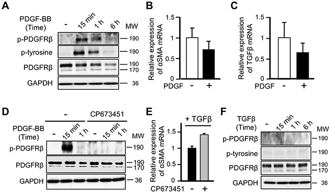 Figure 4: PDGF-PDGFRβ signaling does not affect the differentiation of mesenchymal stem cells into cancer-associated fibroblasts. (A) Lysates of ST2 cells treated with PDGF-BB (20 ng/mL) for 15 min, 1 h, or 6 h were subjected to western blotting with anti-p-PDGFRβ, anti-p-tyrosine, anti-PDGFRβ, and anti-GAPDH antibodies. (B, C) Quantitative RT-PCR analyses were performed to measure mRNA expression of αSMA (B) and TGFβ (C) in ST2 cells treated with PDGF-BB for 48 h. Each bar represents the mean ± SD (N=3). (D) ST2 cells were pre-treated with CP673451 (50 nM) for 2 h and then stimulated with PDGF-BB for 15 min or 1 h. Cell lysates were subjected to western blotting with anti-p-PDGFRβ, anti-PDGFRβ, and anti-GAPDH antibodies. (E) ST2 cells were pre-treated with CP673451 for 1 h and then stimulated with TGFβ (10 ng/mL) for 3 days. Quantitative RT-PCR analysis was performed to measure mRNA expression of αSMA. Each bar represents the mean ± SD (N=3). (F) Lysates of ST2 cells stimulated with TGFβ for 15 min, 1 h, or 6 h were subjected to western blotting with anti-p-PDGFRβ, anti-p-tyrosine, anti-PDGFRβ, and anti-GAPDH antibodies.