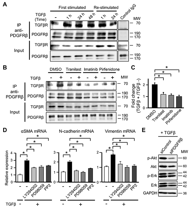 Figure 5: PDGFRβ induces the differentiation of mesenchymal stem cells into cancer-associated fibroblasts by interacting with TGFβ receptor (TGFβR). (A) ST2 cells were stimulated with TGFβ (10 ng/mL) for 1, 24, or 48 h (First stimulated), and ST2 cells stimulated with TGFβ for 48 h were re-stimulated with TGFβ for 1 or 24 h (Re-stimulated). Cell lysates were subjected to immunoprecipitation (IP) using an anti-PDGFRβ antibody or IgG isotype control. Immunoprecipitates were subjected to western blotting with anti-TGFβR and anti-PDGFRβ antibodies. Total cell lysates were examined in parallel. (B) ST2 cells were pre-treated with tranilast (100 μM), imatinib (10 μM), or pirfenidone (0.2 mg/mL) for 12 h and then stimulated with TGFβ for 1 h. Cell lysates were subjected to immunoprecipitation using an anti-PDGFRβ antibody. Immunoprecipitates were subjected to western blotting with anti-TGFβR and anti-PDGFRβ antibodies. Total cell lysates were examined in parallel. (C) The intensities of the bands in (B) were quantified, and the intensity of the TGFβR band relative to that of the PDGFRβ band was determined. Fold changes in the intensity of the TGFβR band were determined by comparing the samples obtained before and after TGFβ stimulation. Each bar represents the mean ± SD (N=3), *P < 0.05. (D) ST2 cells were pre-treated with LY294002 (3 μM), PD98059 (20 μM), or PP2 (500 nM) for 1 h and then stimulated with TGFβ for 48 h. Quantitative RT-PCR analyses were performed to measure mRNA expression of αSMA, N-cadherin, and vimentin. Each bar represents the mean ± SD (N=3), *P < 0.05. (E) ST2 cells were transfected with PDGFRβ-targeting or negative control siRNA for 48 h and then treated with TGFβ for 24 h. Cell lysates were subjected to western blotting with anti-p-Akt, anti-Akt, anti-p-Erk, anti-Erk, and anti-GAPDH antibodies.