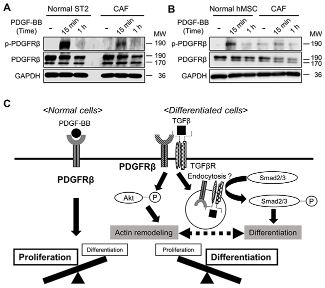 Figure 6: Stimulation with TGFβ alters the functions of PDGFRβ in mesenchymal stem cells (MSCs). (A, B) ST2 cells (A) and human MSCs (B) were pre-treated with or without TGFβ (10 ng/mL) for 72 h and then stimulated with PDGF-BB (20 ng/mL) for 15 min or 1 h. Cell lysates were subjected to western blotting with anti-p-PDGFRβ, anti-PDGFRβ, and anti-GAPDH antibodies. (C) A proposed scheme of how the functions of PDGFRβ change during differentiation into cancer-associated fibroblasts.