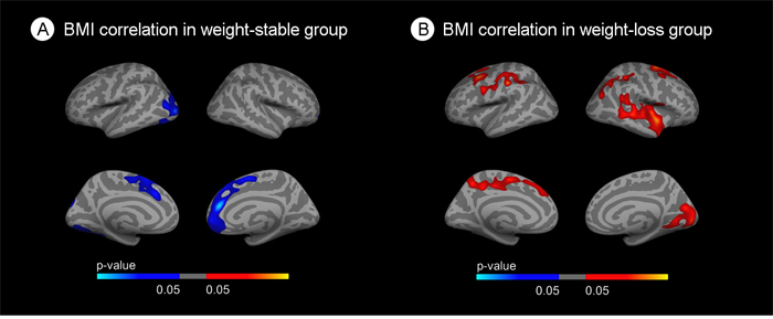 Figure 2: Stratified correlation analysis between body mass index and cortical thickness. (A) Correlation between BMI and cortical thickness in the weight-stable group. (B) Correlation between BMI and cortical thickness in the weight-loss group. Blue areas indicate regions with significant (FWE<0.05) cortical thinning. Red areas represent areas with significant cortical thickening (FWE<0.05). The blue and red gradient colors represent the uncorrected p-values (p<0.05) in the FWE suriving clusters only.