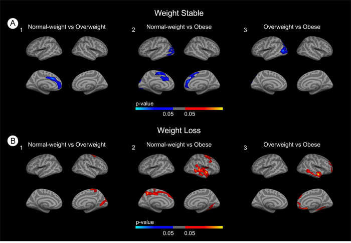 Figure 3: Stratified group comparisons between BMI groups. (A) Group comparisons in the weight-stable group. (B) Group comparisons in the weight-loss group. Blue areas indicate regions with significant (FWE<0.05) cortical thinning. Red areas represent areas with significant cortical thickening (FWE<0.05). The blue and red gradient colors represent the uncorrected p-values (p<0.05) in the FWE surviving clusters only.