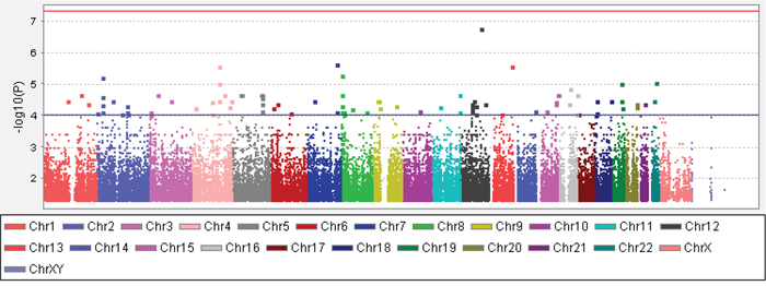Figure 1: The Manhattan plot showing results of the genome-wide SNP association analysis with in vitro cytarabine IC50 of diagnostic leukemic cells within white pediatric AML patients. The y-axis is – log10 the association p-value for the SNPs and the x-axis shows the chromosomal locations of the SNPs. The red line is the genome-wide significance threshold (P=5x10-8) and the blue line is the suggestive threshold (P=1x10-4).