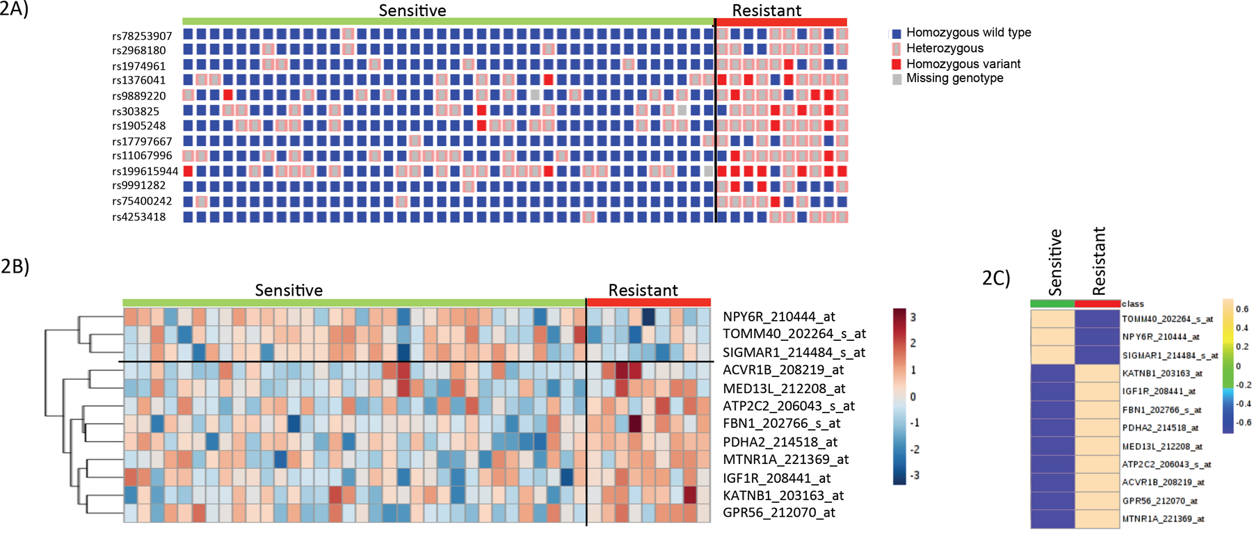 Differential gene expression for genes within +/-500kb of the significant/suggestive GWAS SNPs was conducted using Wilcoxon test to detect genes differentially expressed between the sensitive and resistant groups. cis eQTL analysis was conducted on candidate SNP-gene pairs identified in the GWAS and differential gene expression analysis above using Wilcoxon and Kruskal-Wallis tests, depending on how many genotype groups are available for each SNP. These analyses were done using R statistical software version 3.4.0.[46].