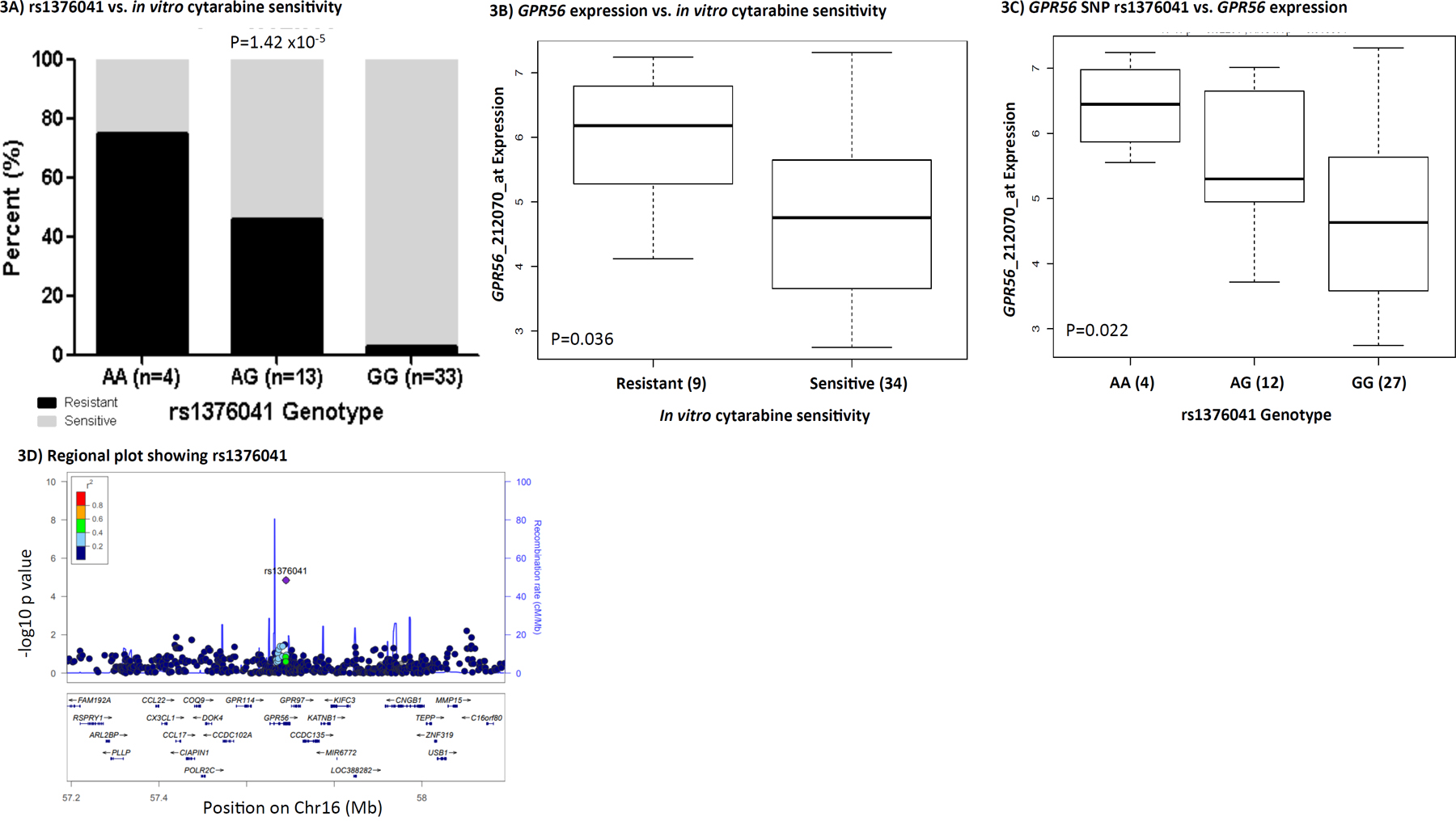 Figure 3: GPR56 and rs1376041. (A) Bar-plot showing the distribution of cytarabine sensitive and resistant cases within genotype groups for rs1376041. (B) Boxplot showing the association of leukemic cell GPR56 gene expression levels between cytarabine sensitive and resistant cases. (C) Boxplot demonstrating association of rs1376041 genotypes with GPR56 gene expression. In boxplots, the y-axis represents natural logarithm of gene expression and the x-axis shows the sensitive/resistant groups or genotype groups. The horizontal line inside the box represents the median value of each group, the lower hinge of the box represents the 25th percentile, the upper hinge represents the 75th percentile and the lower and upper whiskers here display 1.5 times the interquartile range. The outliers are defined as data points that fall outside of the first and third quartiles by more than 1.5 times the interquartile range. (D) Regional plot showing -log10 p-value of the association of SNPs with cytarabine in vitro sensitivity on the y-axis and genes on chromosome 16 within +/- 500kb from rs1376041 on the x-axis. As denoted by the legend with colors indicating linkage disequilibrium, rs1376041 was not in linkage disequilibrium with other SNPs within the region.