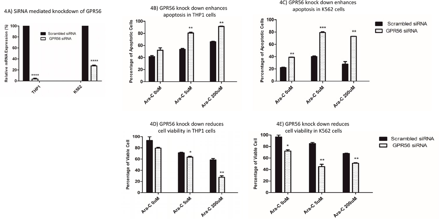 Figure 4: Impact of siRNA mediated knockdown of GPR56 on cytarabine sensitivity in THP1 and K562 cell lines. (A) GPR56 mRNA levels in THP1 and K562 cells transfected with scrambled or GPR56 specific siRNAs. Impact of siRNA mediated knockdown of GPR56 on apoptosis (B and C) and cell viability (D and E) post cytarabine treatment in THP1 and K562 cell lines. *P<0.05, **P<0.01, ***P<0.001, ****P<0.0001.