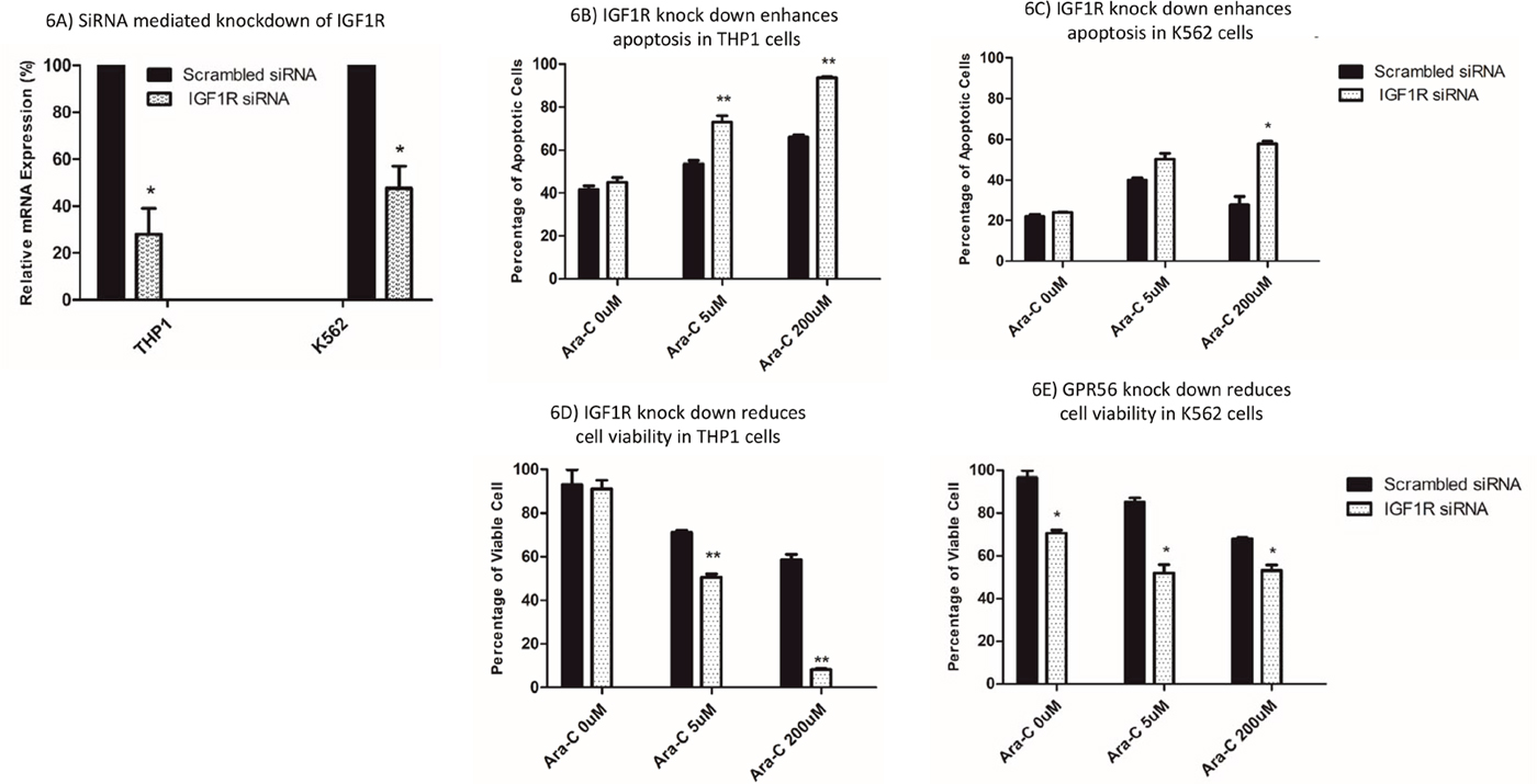 We further investigated the impact of siRNA mediated transient knockdown of IGF1R on cellular sensitivity to cytarabine. siRNA mediated knockdown resulted in reduction in IGF1R mRNA in THP1 and K562 cell lines (P<0.05, Figure 6A). IGF1R knockdown enhanced apoptosis and correspondingly had reduced cell viability in response to cytarabine treatment, in THP1 cell lines (Figure 6B and 6D) and K562 cell lines (Figure 6C and 6E).