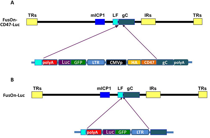 Figure 1: Schematic illustration of virus construction strategy. (A) Insertion of EGFP-Luc gene cassette and the CMVp-HAtag-CD47ECD into the backbone of FusOn-H3. This was done through homologous recombination, with the left flanking (LF) sequence and the 3ʹ region of gC (from the transmembrane domain to the polyA) as the right flanking sequence. (B) Insertion of EGFP-Luc gene cassette alone into the 5ʹ side of the gC gene in FusOn-H3 as a control virus. The details of individual components in each gene cassette are depicted in lower part of the drawings and are labelled accordingly. The abbreviations are: CMVp, cytomegalovirus immediate early promoter; LTR, Rous Sarcoma long terminal repeats that contain the promoter region of this virus; GFP-Luc, EGFP-luciferase fusion gene; HA, HA tag; CD47, murine CD47 extracellular domain; gC, the complete gC coding region. LF, the left flanking region of gC. The recombinant viruses were identified by GFP expression and purified to homogeneity.
