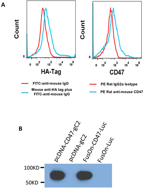 Figure 2: Assessment of transgene expression. (A) Detection of cgC expression by flow cytometry. 293 cells were infected with either FusOn-CD47-Luc (blue line) or FusOn-Luc (red line) for 24 h. Cells were then stained with either mouse anti-HA-tag or PE conjugated anti-mCD47 IgG. A FITC-conjugated goat anti-mouse IgG was used as the second antibody for anti-HA tag staining. (B) Detection of cgC expression by Western blot. Cell lysates were prepared from 293 cells either infected with the viruses (FusOn-CD47-Luc or FusOn-Luc) or transfected with plasmids (pcDNA-CD47-gC2 or pcDNA-gC2). Western blot analysis was done on the cell lysates by using anti-HA tag IgG as the first antibody and horseradish peroxide conjugated goat anti-mouse IgG as the second antibody.