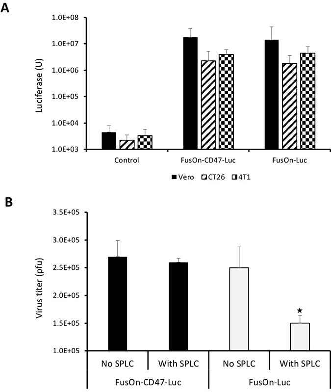 Figure 3: Comparison of FusOn-CD47-Luc and FusOn-Luc for luciferase expression and ability to evade clearance by phagocytes. (A) Comparison of luciferase expression between these two viruses. Vero, CT26 and 4T1 cells were infected with the viruses at 1 pfu/cell and were harvested 24 h later for quantitation of luciferase activity. (B) Comparison of virus yield with or without the presence of phagocytes. Vero cells in 12-well plates were infected with either virus at 0.1 pfu/cell without or with the presence of 200,000 splenocytes. Cells were harvested 48 h and the virus yield was determined by plaque assay. ★p < 0.05 as compared with other three wells. The experiments with tumor cells (CT26 and 4T1) and Vero cells in A were conducted at different dates.