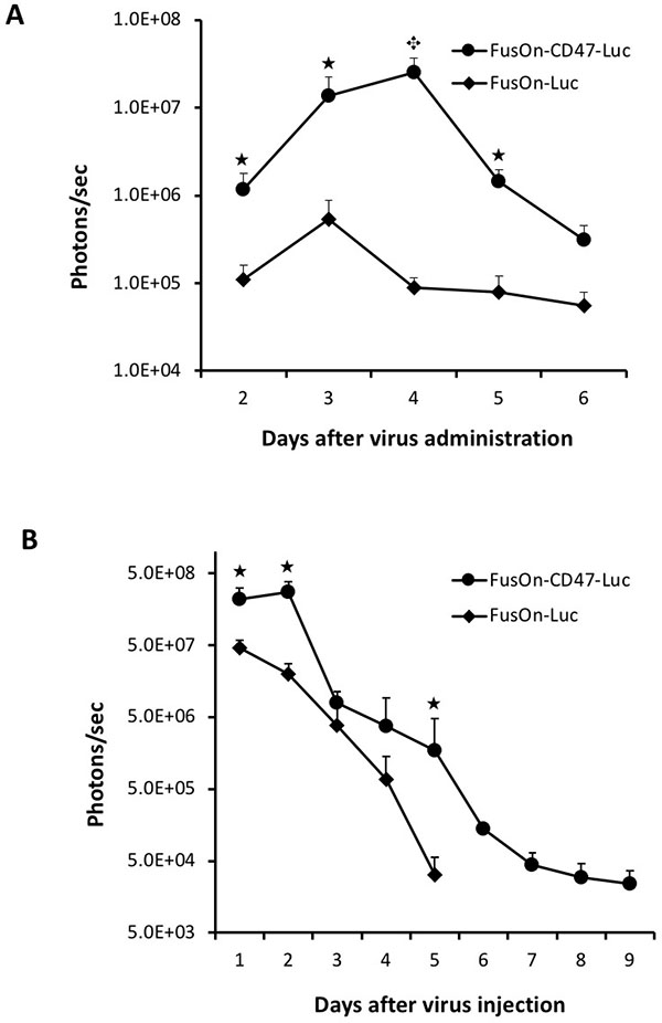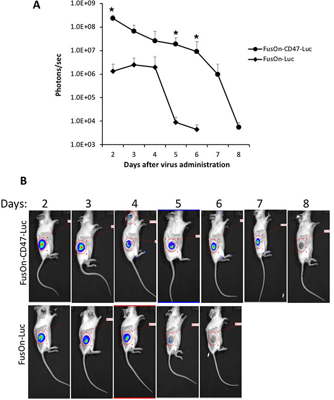 Figure 4: Comparison of FusOn-CD47-Luc and FusOn-Luc delivery by the systemic route in CT26 tumor model. Tumor was established at the right flank of Balb/c mice by subcutaneous implantation of CT26 cells. Once tumor reached the approximate size of 8 mm in diameter, 2 × 106 pfu of either FusOn-CD47-Luc or FusOn-Luc was given systemically. Animals were imaged daily starting on day 2 for luciferase expression. (A) Mean photon reading from daily IVIS imaging measurement. ★p < 0.01 as compared to FusOn-Luc. (B) A typical mouse from each group showing the actual imaging.