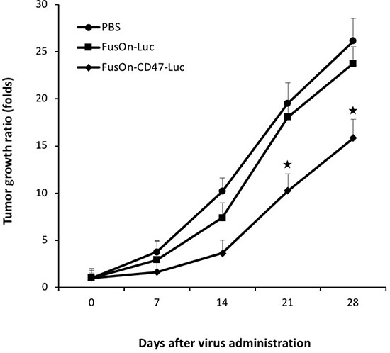 Figure 6: Therapeutic evaluation of virotherapy against CT26 tumor after systemic delivery of oncolytic viruses. 2 × 106 pfu of FusOn-CD47-Luc or FusOn-Luc was given to tumor-bearing mice systemically. Another group of mice was given PBS as a negative control. Tumor size was measured weekly and was presented as tumor growth ratio, which was determined by dividing the tumor volume measured on the indicated time after virus injection by the tumor volume before treatment. ★p < 0.05 as compared to FusOn-Luc.