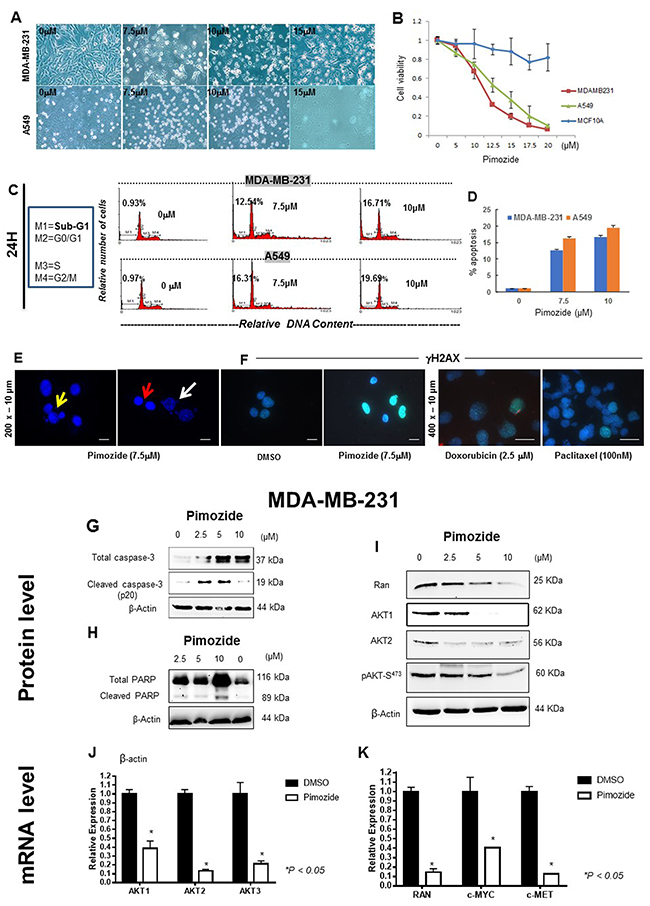 Figure 1: Pimozide inhibits cell proliferation in a dose- and time-dependent manner by inducing cell cycle arrest and DNA double strand breaks (DSBs). (A) Phase contrast micrograph showing cell morphology of human breast cancer MDA-MB-231 and lung cancer A549 cells treated with Pimozide at different doses (μM) for 24 hours. Scale bar 100 μm. (B) Viability of MDA-MB-231 cancer cells, MCF10A normal breast cells, and A549 lung cancer cells after 48 hours treatment with Pimozide. (C) Cell cycle profiles. DNA content of fixed, propidium iodide-stained cells was analyzed by flow cytometry. MDA-MB-231 and A549 cells were incubated in the absence (control 0 μM of Pimozide with DMSO) or in the presence of Pimozide at different doses for 24 hours, and the percentage of cells in sub-G1 (M1) (hypodiploidy), G0/G1 (M2), S (M3), and G2/M (M4) phases calculated using flow cytometry. The data gatings are indicated for each DNA histogram for M1, M2, M3 and M4. The percentage of cells with a DNA content less than G1 (sub-G1) is indicated in each histogram. The cell cycle profiles shown, with the sub-G1 population indicated, are representative of three experiments performed. (D) Cell cycle profile (Sub-G1) summarized using a histogram. MDA-MB-231 and A549 cells were treated with different doses of Pimozide for 24 hours, and the percentage of cells in the sub-G1 phase of the cell cycle (dead and dying cells) was quantitated by flow cytometry. Data shown are means ± SD of three independent experiments, **, P < 0.01, Student’s t-test. (E & F) DNA damage response (DDR) measured after treatment with Pimozide, Doxorubicin (Doxo) and Paclitaxel (Pac). (E) Representative fields of DAPI-stained DNA showing nuclear damage after 7.5 μM Pimozide treatment. Some nuclei show signs of dynamic DNA membrane blebbing (white arrow) and fragmentation after treatment for 48 hours, whilst other nuclei remained unchanged. There is also fragmented DNA outside (red arrow), and inside the nucleus (yellow arrow) suggesting chromatin condensation after treatment. Magnification 200x. Scale bar 10 μm. (F) Staining for histone γH2AX in MDA-MB-231 cells treated with 7.5 μM Pimozide or with 2.5 μM Doxorubicin or 100 nM Paclitaxel for 24 hours, images are representative of three experiments performed. Magnification 200x for DMSO and Pimozide treatment. Scale bar 10 μm. Magnification 400x. Scale bar 10 μm for Doxorubicin and Paclitaxel treatment. Pimozide reduced the protein and RNA expression of AKT and Ran, as well as RNA expression of cMYC and cMET. (G) Western blotting analysis of Caspas-3 in MDA-MB-231 treated with Pimozide at different doses for 24 hours. β-Actin was used as a loading control. Data shown are representative of three experiments performed. (H) Western blotting analysis of PARP in MDA-MB-231 treated with Pimozide at different doses for 24 hours. β-Actin was used as a loading control. Data shown are representative of three experiments performed. (I) Western blotting analysis of Ran, AKT1, AKT2 and pAKT in MDA-MB-231 treated with Pimozide at different doses for 24 hours. β-Actin was used as a loading control. Data shown are representative of three experiments performed. (J) Relative mRNA expression of all AKT isoforms in MDA-MB-231 cells either untreated or treated with Pimozide 7.5 μM for 24 hours. Data shown are representative of three experiments performed. (K) Relative mRNA expression of Ran, c-MYC and c-MET in MDA-MB-231 cells treated with 7.5 μM Pimozide for 24 hours. Data shown are representative of three experiments performed.