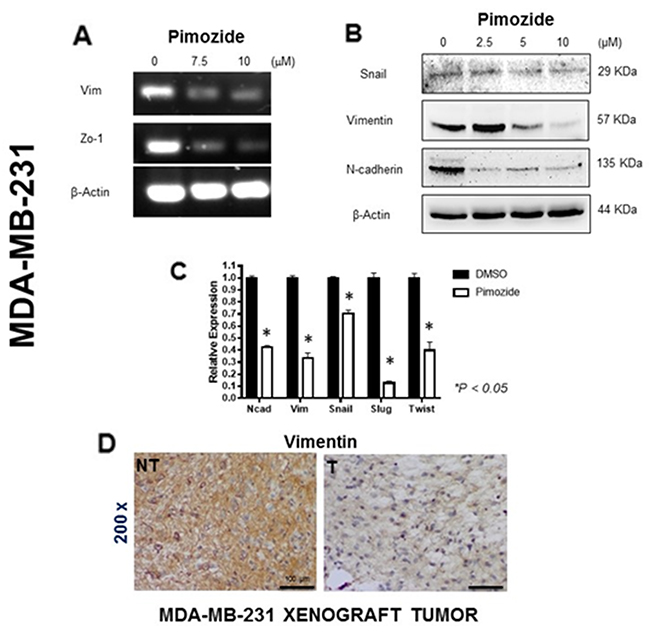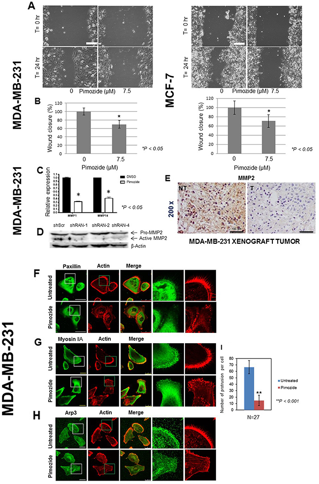 In this work, we identified Pimozide as a potential inhibitor of Ran using connectivity map analysis [16] of the breast cancer cell line MDA-MB-231, previously silenced by shRNA against the expression of the Ran gene. Pimozide was previously shown to inhibit proliferation of the human breast cancer-derived cell line MCF-7 in vitro by blocking estradiol-induced growth [17]. Pimozide has gained attention as an anti-cancer agent by acting as a STAT5 inhibitor in chronic myelogenous leukemia cells [18], as well as an inhibitor of STAT3 signaling pathway in hepatocellular carcinoma and suppressing cancer stem-like cell maintenance [19]. Previous work has demonstrated that Pimozide inhibited cell growth of Hepatocellular carcinoma (HCC) cells by disrupting the Wnt/β-catenin signaling pathway and reducing epithelial cell adhesion molecule (EpCAM) expression [20]. To explore the mechanisms involved in Pimozide inhibition of cancer and metastasis, we have analyzed the effect of Pimozide on breast cancer cell lines in vitro and breast cancer xenograft models in vivo. In this study, we demonstrate that Pimozide decreases Ran mRNA expression and reduces the expression of AKT and phosphorylation of VEGFR2 in breast cancer cell lines and in Human Umbilical Vein Endothelial Cells (HUVECs), leading to increased caspase-3 activation and apoptotic cell death. Pimozide also causes a reduction in cell proliferation, cell migration and invasion in vitro and of lung metastasis in vivo. Taken together, these results suggest that Pimozide may be of practical value in the management of human breast cancer, and could play a pivotal role in inhibiting cellular proliferation, migration, and metastasis.