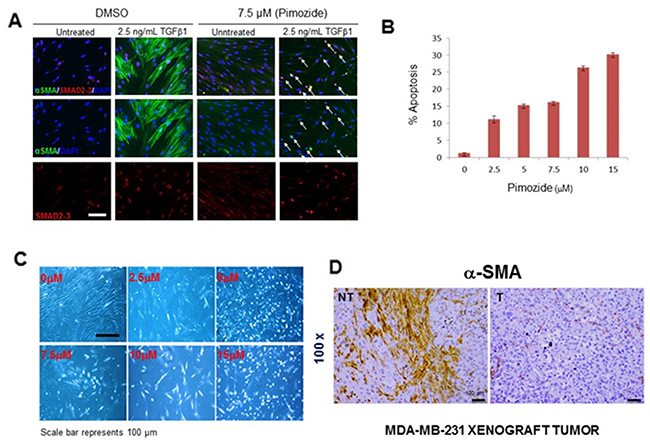 Figure 6: Pimozide suppresses fibroblast differentiation, reduces cell proliferation and increases apoptosis. (A) Immunofluorescent detection of α-SMA/SMAD2-3 in untreated (DMSO) and treated fibroblasts with 7.5 μM Pimozide for 24 hours. The nuclei are stained blue (DAPI), smooth muscle in differentiated fibroblasts green, and SMAD2-3 red (nuclear staining). Primary human fibroblasts were pre-treated with 7.5 μM Pimozide, 1 hour prior to TGFβ1 treatment. Fibroblasts were stimulated to differentiate by addition of TGFβ1 for 72 hours. In vehicle control (DMSO)-treated cultures fibroblast differentiation was observed by the formation of polymerized smooth muscle actin filaments. However, in the presence of Pimozide, TGFβ1 was unable to promote the formation of these filaments. In Pimozide treated cells, SMAD2-3 is nuclear both in the control and TGFβ1-treated cultures. Exposure TGFβ1 treated fibroblasts to Pimozide resulted in increased apoptosis which is apparent from the increased number of condensed nuclei (white arrows). Scale bar 100 μm. (B) Cell cycle profile (Sub-G1) summarized using a histogram. Primary fibroblast cells were treated with different doses of Pimozide for 24 hours, and the percentage of cells in the sub-G1 phase of the cell cycle (dead and dying cells) was quantitated by flow cytometry. Data shown are means ± SD of three independent experiments, **,P < 0.01, Student’s t-test. (C) Phase contrast micrograph showing the morphology of fibroblast treated with Pimozide at different doses for 48 hours. Scale bar 100 μm. (D) Immunohistochemical staining for α-SMA in MDA-MB-231 tumors from untreated mice (PBS) and treated mice (representative of 10 sections per group). Magnification 100x. Scale bar 100 μm.