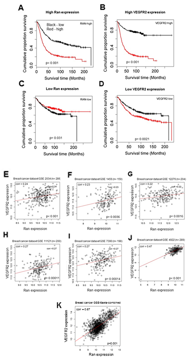 Five breast cancer datasets [GSE1456 [66], GSE2034 [67], GSE4922 [68], GSE7390 [69], GSE12276 [70]], obtained from Gene Expression Omnibus (GEO) (https://www.ncbi.nlm.nih.gov/geo/), each consisting of more than 150 patients with their corresponding microarray gene expression data and survival data available in GEO were included in this study. The datasets were pre-processed as previously described using R and Bioconductor for normalization [71]. Information about the patients and breast cancer samples can be found on the GEO website. All these data sets were used to generate the Kaplan-Meier curves. The combined breast cancer dataset consisted of 1096 patients. The patients were first split into two groups by the median expression value of RAN (or VEGFR2), resulting in a RAN-high group and a RAN-low group. Then within each group the patients were split by the median expression value of the other gene, VEGFR2 (or correspondingly RAN), into two sub-groups, for which two Kaplan-Meier curves were created. Wald test were used to assess if they were significantly different. The low or high expression status is determined by the median expression level, above which is considered as “high” and below the median is “low” expression. The correlation in expression between Ran and VEGF2 was assessed using Pearson’s correlation analysis, based on the same sets of GEO data series used to generate Kaplan-Meier curves with an additional data series GSE11121 [72]. The latter was not used in the combined survival analysis, because GSE11121 has metastasis-free survival data rather than relapse-free survival data as the other 5 data series.