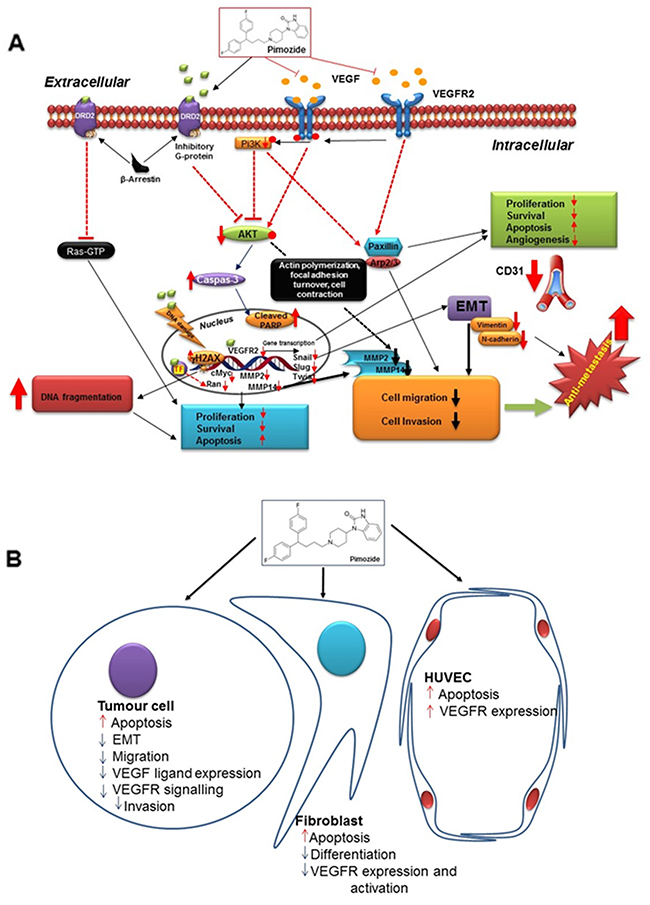 Antipsychotic drugs (APDs) are the first pharmacotherapeutic line of treatment for schizophrenia. They are also widely used for the treatment of bipolar disorder and other idiopathic psychotic disorders. The primary molecular targets of ADPs are the neurotransmitter receptors, dopamine receptors and their interaction are thought to be important for the “normalization” of neurotransmitter imbalances that are associated with specific symptoms and the acute manifestation of schizophrenia. Pimozide is a neuroleptic drug selectively blocks dopamine receptor D2 (DRD2) [1, 2], used to treat a number of mental/mood disorders (chronic schizophrenia), as well as other psychotic disorders, as it reduces dopamine activity and consequently decreases excitation, agitation, hypermobility, and abnormal conditions associated with excess energy [3, 4]. It has long been suggested that patients with schizophrenia have a reduced incidence of cancer compared to the general population [5, 6]. Many epidemiological studies have been conducted to investigate this possible link, but cancer risk in schizophrenic patients remains a controversial issue [7–9], although antipsychotic drugs have been suggested as possible mediators of this effect [5, 10, 11].