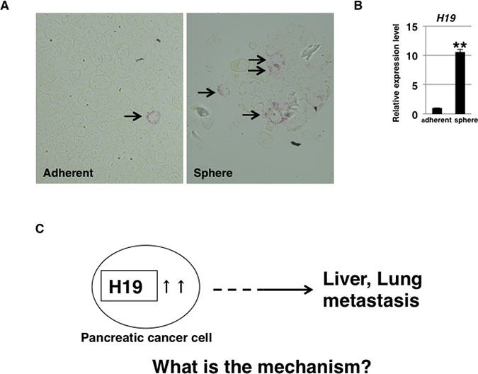 Figure 1: H19 expression in PDAC cells. (A) H19 expression was analyzed by performing in situ hybridization in PANC-1 cells. Fewer H19-expressing cells were detected among PANC-1 cells cultured under the adherent condition (left) than among PANC-1-cell spheres (right). Original magnification, 400×. (B) qRT-PCR analysis of H19 was performed using cDNA derived from adherent and 3D-cultured PANC-1 cells. **P < 0.01. (C) Schematic depiction of the question addressed in this study. Results are presented as means ± SD from three independent experiments.