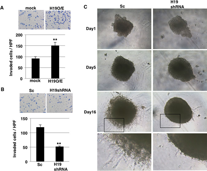 Figure 4: H19 promotes invasion in PDAC cells. (A and B) Matrigel invasion assays were performed using mock and H19-overexpressing cells (A) or Sc and H19-knockdown cells (B). **P < 0.01. (C) 3D invasion assays were performed using Sc and H19-knockdown cells. Representative images from Days 1, 5, and 16 are shown. The high-magnification images show that typical invasive cells were more numerous among Sc cells than H19-knockdown cells.