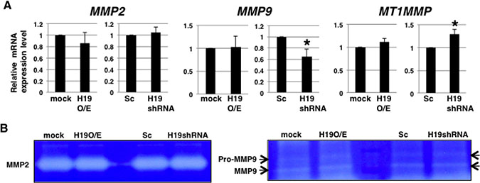 Figure 5: H19 does not contribute to MMP activity in PDAC cells. (A) qRT-PCR analysis of MMPs was performed using cDNA derived from mock and H19-overexpressing cells or Sc and H19-knockdown cells. Results are presented as means ± SD from three independent experiments. *P < 0.05. (B) Gelatin zymography analyses were performed using culture supernatants from mock and H19-overexpressing cells or Sc and H19-knockdown cells. Representative results from three independent experiments are shown.