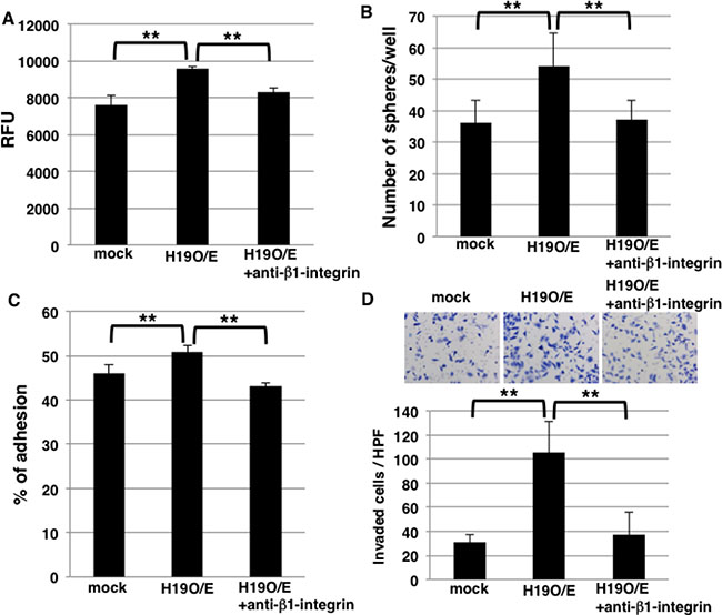Figure 7: Blocking of β1-integrin inhibits sphere formation and invasion in H19-overexpressing cells. (A) Cell-cell adhesion assays were performed on mock and H19-overexpressing cells, with or without anti-β1-integrin antibody treatment. Adherent cells were indicated by RFU (relative fluorescence units). **P < 0.01. (B) Results of sphere-formation assays showing that the formation of an increased number of spheres by H19-overexpressing cells was inhibited by anti-β1-integrin antibody treatment. **P < 0.01. (C) Adhesion assays were performed on mock and H19-overexpressing cells, with or without anti-β1-integrin antibody treatment. **P < 0.01. (D) Matrigel invasion assays were performed on mock and H19-overexpressing cells, with or without anti-β1-integrin antibody treatment. **P < 0.01.