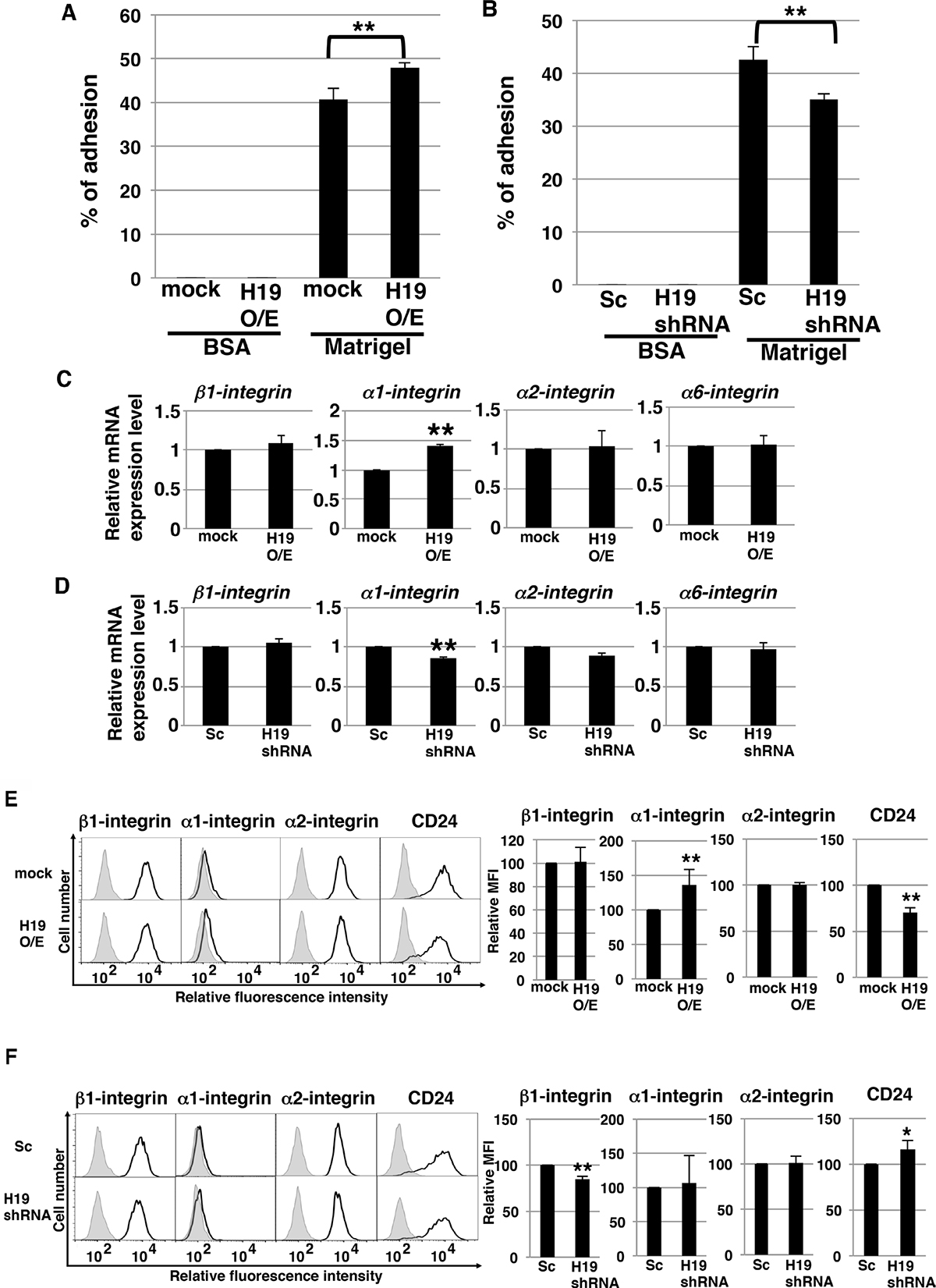 During the process of invasion, a critical event is the adhesion of cancer cells to the extracellular matrix [31]. We investigated whether H19 contributes to this cell-to-matrix adhesion step. Adhesion assays on Matrigel revealed that H19-overexpressing cells exhibited a statistically significant increase in adhesiveness (~50% adherent cells, versus ~40% in the case of mock cells) (Figure 6A), whereas H19-knockdown cells exhibited a significant decrease in adhesiveness (~35% adherent cells, versus ~40% in the case of Sc cells) (Figure 6B). These results indicate that H19 supports cell-matrix adhesion. Integrins, which mediate the crosstalk between tumor cells and basement-membrane proteins, are major cell-surface receptors and play a critical role in cell adhesion, invasion, and metastasis induction [32–34]. We therefore investigated whether H19 promotes cell adhesion through regulation of integrins. qRT-PCR results showed that, while α1-integrin was upregulated in H19-overexpressing cells (Figure 6C), it was downregulated in H19-knockdown cells (Figure 6D), which suggests that H19 positively regulates the expression of α1-integrin. Furthermore, we examined the cell-surface expression of integrins and that of the epithelial marker CD24. Fluorescence-activated cell sorting (FACS) analysis revealed that α1-integrin expression was low in mock cells, but markedly increased in H19-overexpressing cells, and that CD24 expression was reduced in H19-overexpressing cells (Figure 6E). This suggested that H19-overexpressing cells present metastatic mesenchymal phenotypes. By contrast, H19-knockdown cells exhibited a substantial reduction of β1-integrin expression but elevated expression of CD24 relative to Sc cells (Figure 6F), suggesting that H19-knockdown cells are more epithelial-cell-like and less metastatic than Sc cells. Taken together, these results support our proposal that H19 contributes to cell adhesion by regulating both the transition of epithelial cancer cells to a mesenchymal state and integrin expression.
